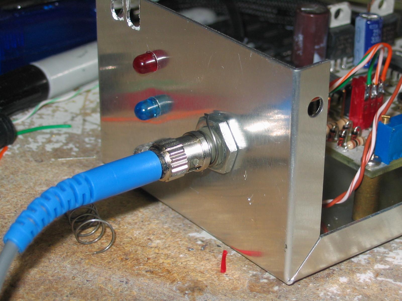 Seen here is my latest driver setup. Some more details can be found here. The 3 LEDs are power, signal indicator (from controller) and over-current limit. The aluminum box mainly serves to provide shielding for the fiber optic receiver, and serves to nicely package the driver all in one box. If not properly shielded, i have had these Rx's extend my pulse widths excessively (sometimes making a big fat yellow spark). Its noise induced from the secondary coil, as the problem does not exist when driving the primary system alone.